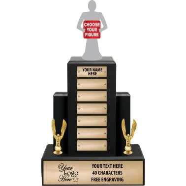 A Large Engrave Plate With FREE Engraving Up To 40 Characters Is Included. Your Logo FREE On 50+ Piece Orders. One Time $45 Logo Fee For Orders Less Than 50 Pieces. To Create A Complete Look, This Trophy Comes With Blank Small Plates Attached.