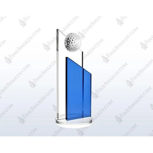 Excellence is honored in golf awards with the sleek lines of the Blue Success Golf Award. A tall clear expanse exposes a crystal golf ball nestled in its palate. A rich blue crystal piece with a duplicated design is positioned in front to reflect light and movemnt from one crystal palate to the other. This optical award is an honor to present and receive for avid golfers.
