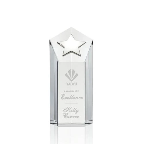 Sleek Optical Crystal features a gleaming Silver Cast Metal Star. The perfect award to recognize a Star Performance. Also available in Gold.