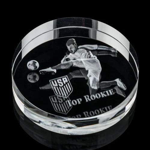 The optical crystal Medina paperweight embodies a circular looking glass that brings your image to life! Turn your award into a magnificent work of art with Dimensions 3D crystal.